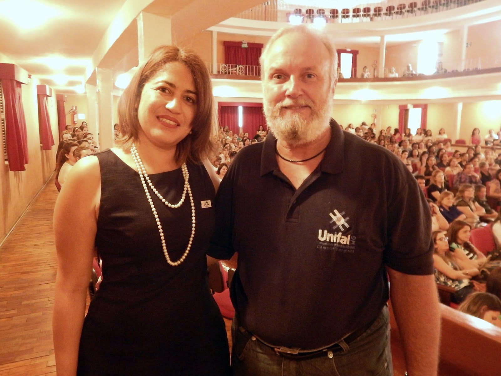 | Prof. Dr. Hélio Lemes apresentando palestra no Cine Teatro de Extrema |
